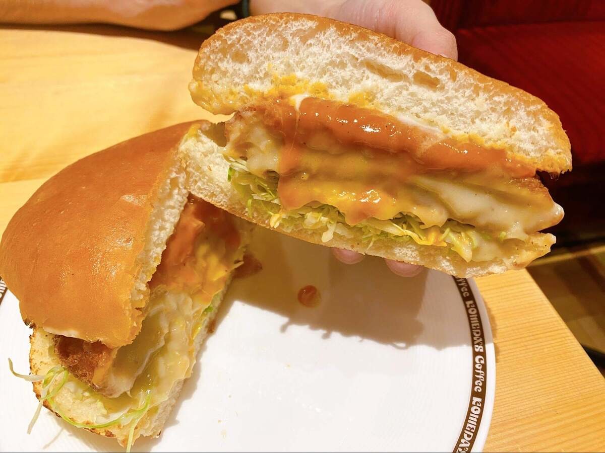 相変わらずの大きさ!コメダ好きには定番ですが、やっぱり揚げ物が挟まってこのサイズは笑っちゃいます。