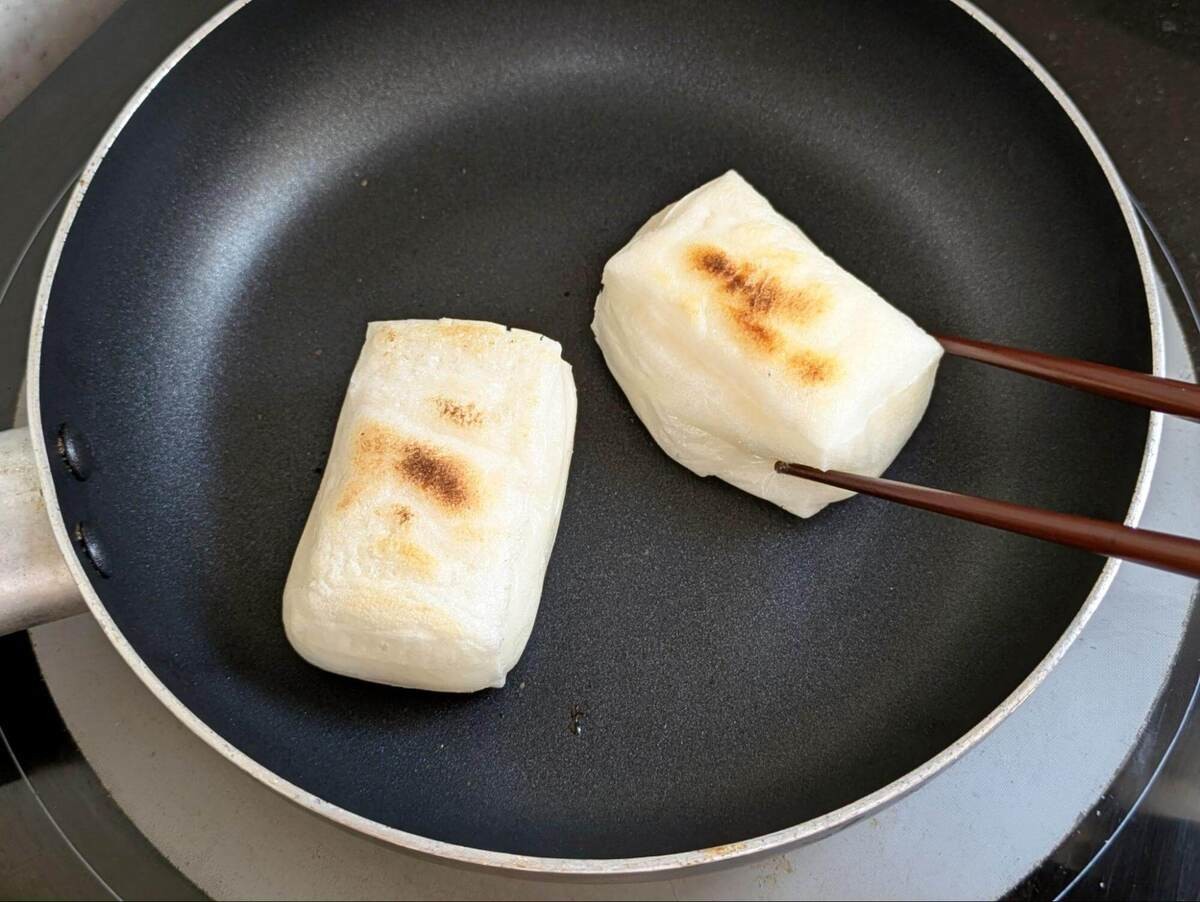 フライパンでじっくり焼くと、外はカリッと中はもっちりとした食感に。