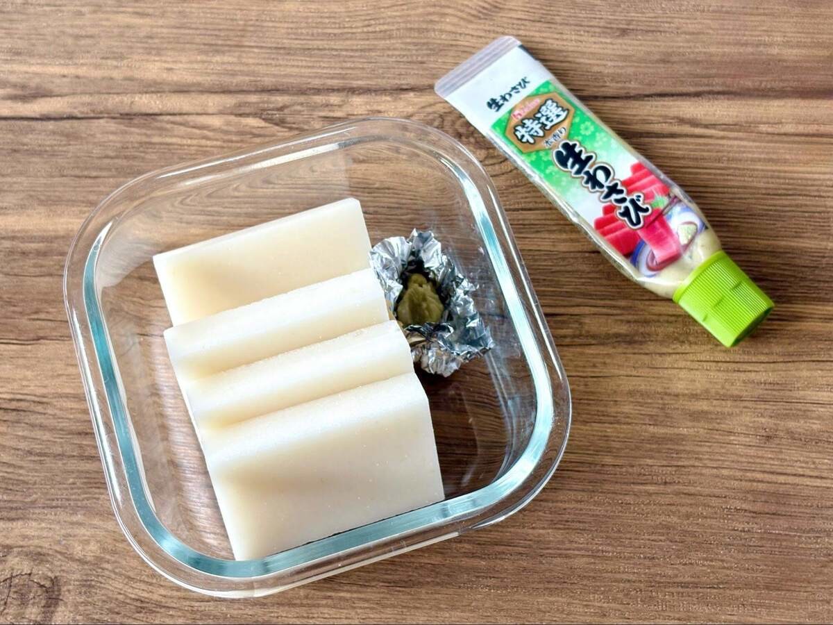 保存容器にお餅を並べてお弁当用のカップにわさびを入れ、フタを閉めて冷蔵庫に移しましょう。