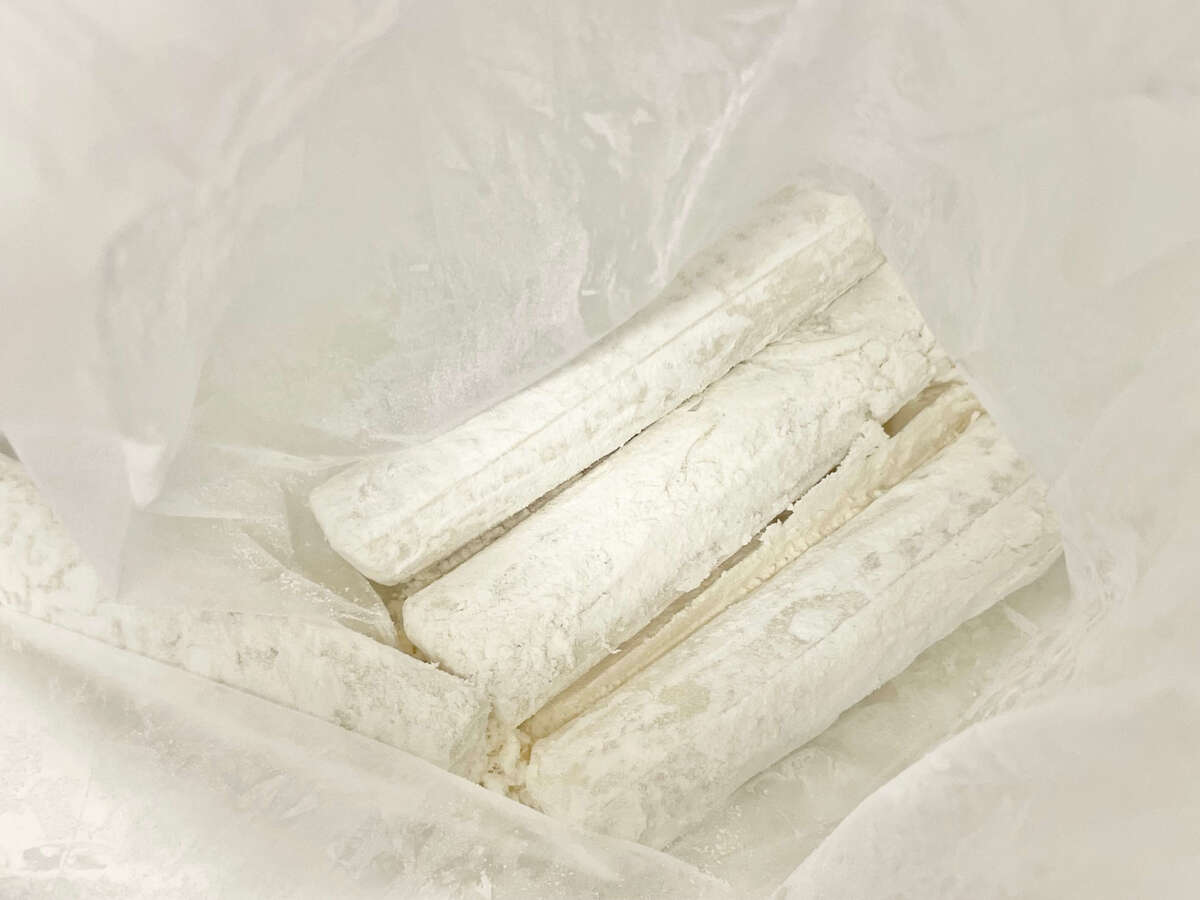 ポリ袋にチーズと薄力粉を入れて振ると、満遍なく粉がつき、手も汚れません。
