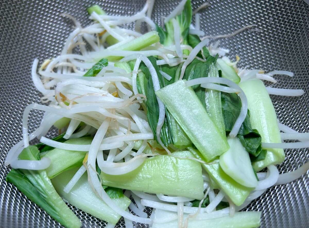 お湯はこの後また使用します。菜箸などを使って、チンゲン菜ともやしだけを取り除くようにしてくださいね。