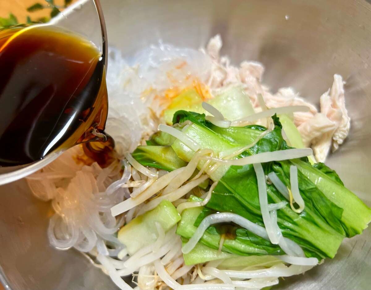 チンゲン菜ともやし、ささみ、マロニーをボウルに入れたら、ポン酢とラー油を加えて和えます。