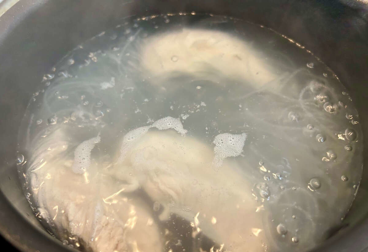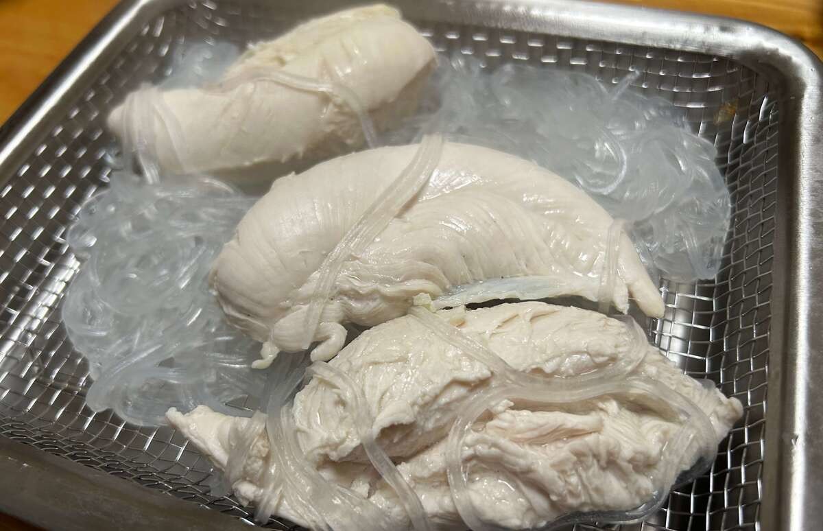 続いてささみを加えたら、さらに3分ほど茹でて、ざるに上げて水分を切ります。