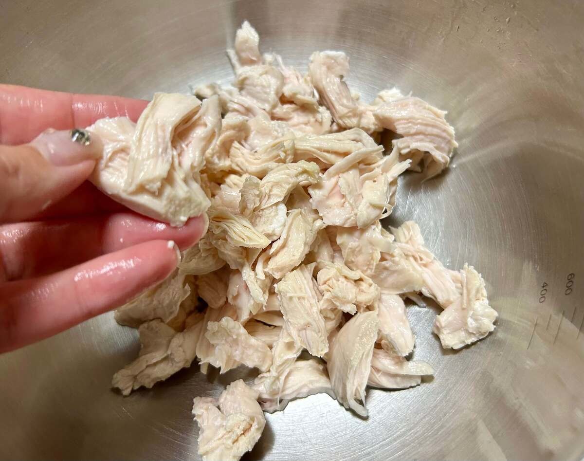 ささみはひと口大にさき、マロニーは食べやすい大きさにキッチンバサミでカットしておきましょう。