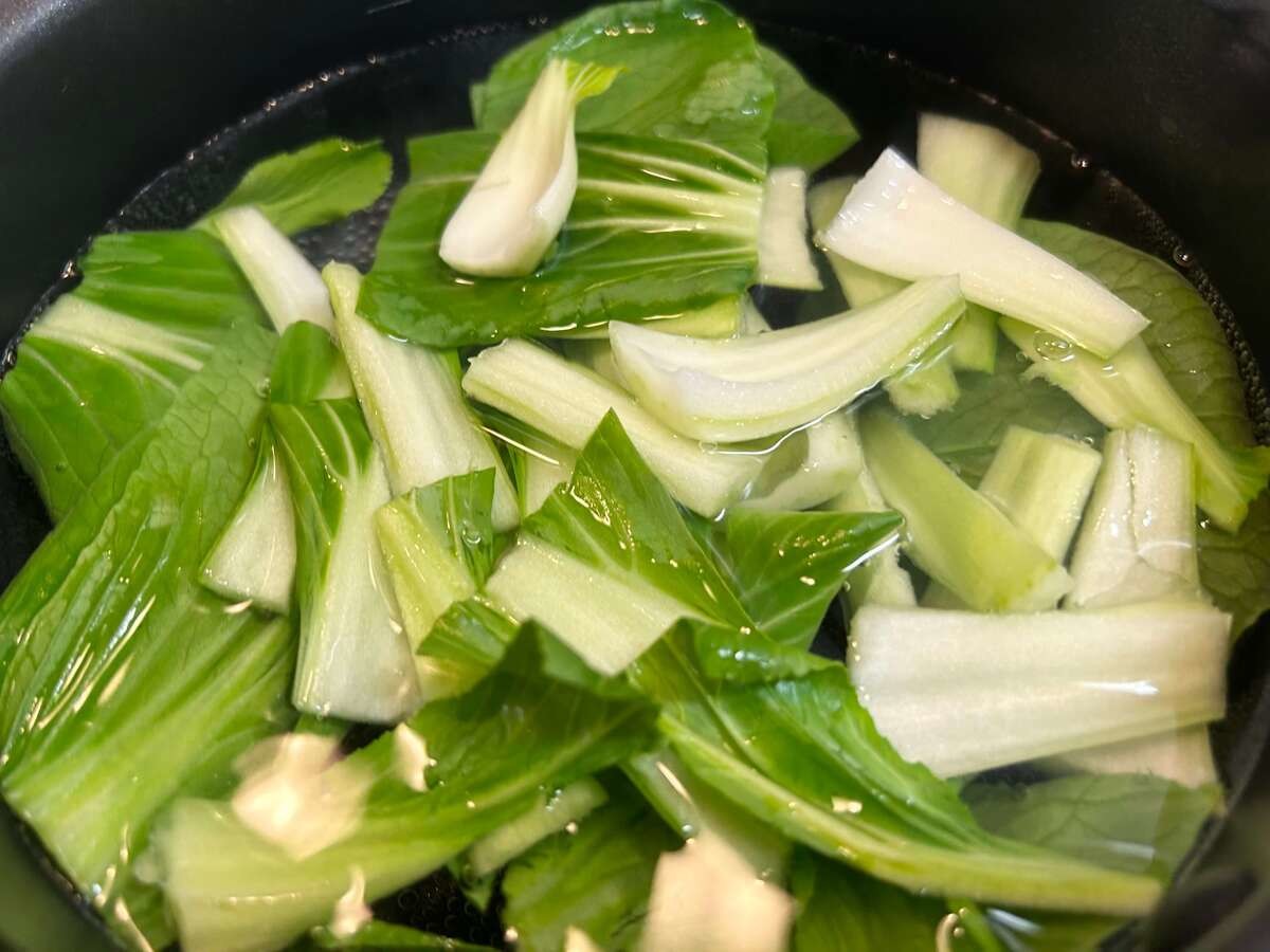 鍋で湯を沸かしたら、チンゲン菜を入れて30秒茹でます。