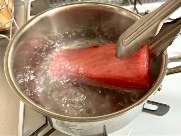 まぐろがさくのまま入るくらいのサイズの鍋にたっぷりお湯を沸かし、まぐろを茹でます。