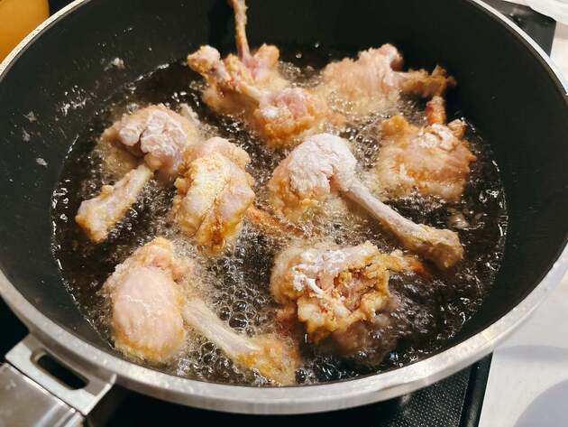 初めは強めの中火で、温度が上がってきたら火を弱めて調整しましょう。手羽先の表面から泡が出てきたら、温度が上がってきたサインです。