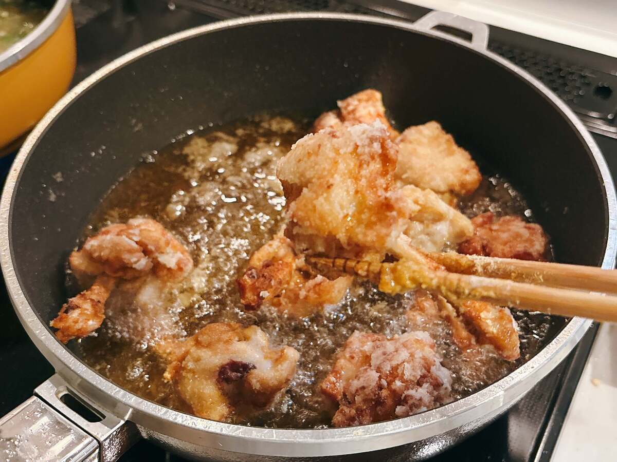 から揚げを作るときは、いつもたっぷりの油を使っているのでこれはラク!しかも、油の節約になるのが最高です。油、ここ最近高いので……(涙)。