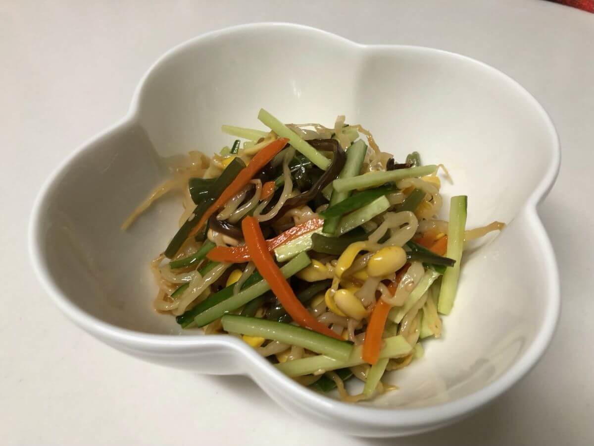 商品は「ビビンバ」ですが、大豆もやしや人参、きくらげ、芋づる、ぜんまい、山せりなどを刻んでしょうゆ漬けにしたシンプルなナムルです。