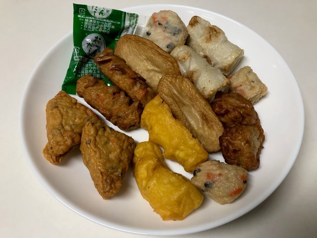 大根や卵、こんにゃくを加えてボリューム感を出せば、夕食のメイン料理にもなり、焼ちくわやごぼう棒天、さつま揚げ、玉ねぎボール、もっちもち棒天、白揚野菜天、野菜白ボール、三角揚げと214円(税込)とは思えない内容量です。