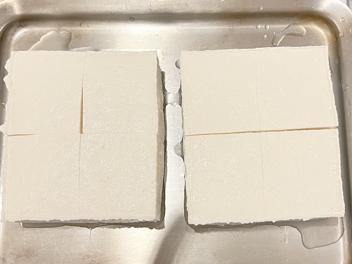 豆腐は1丁を4等分にします。大ぶりの方がおいしいけれど、お好みの大きさでいいよ、とのこと。お手本通りに1/4にしました。食べごたえがありそうな大きさです。