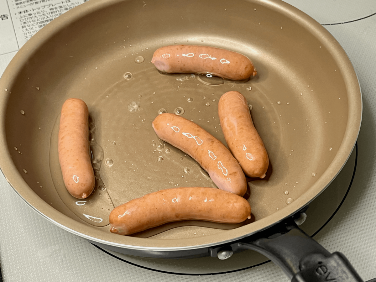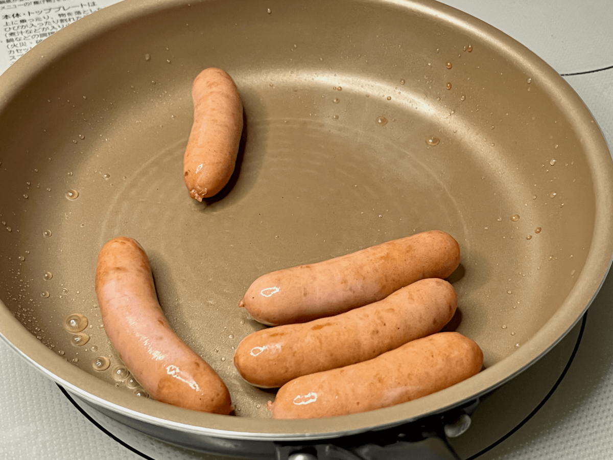 - フライパンにウインナーを並べる