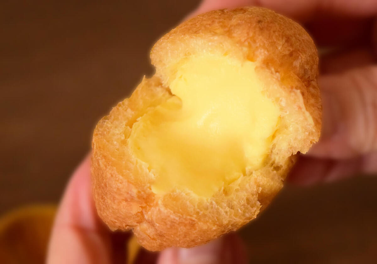 ホイップクリームとカスタードクリームの2層仕立てで、卵のコクを感じる味わいに、ほどよくミルキーで濃厚な仕上がり。シュー生地はやややわらかめです。