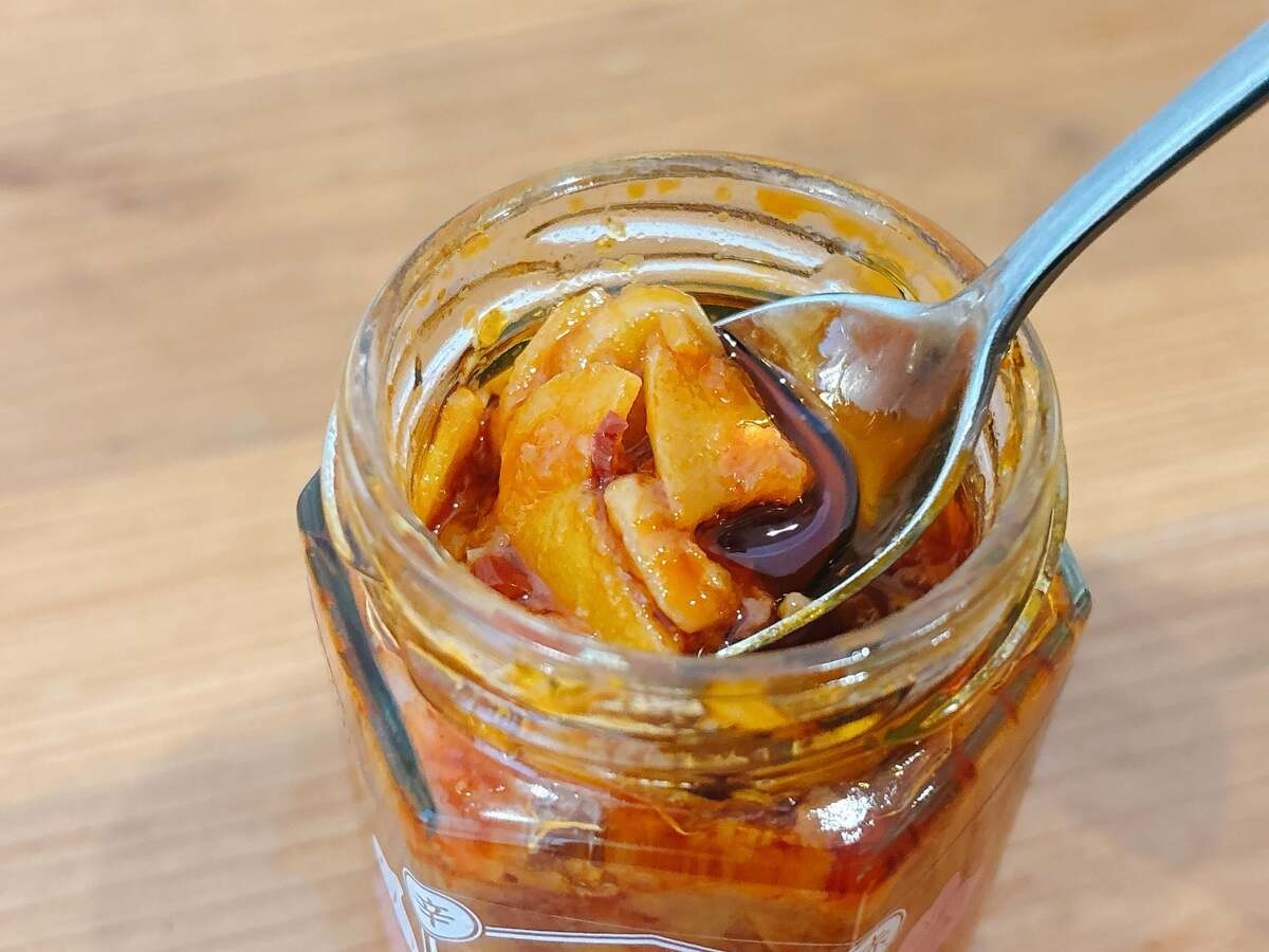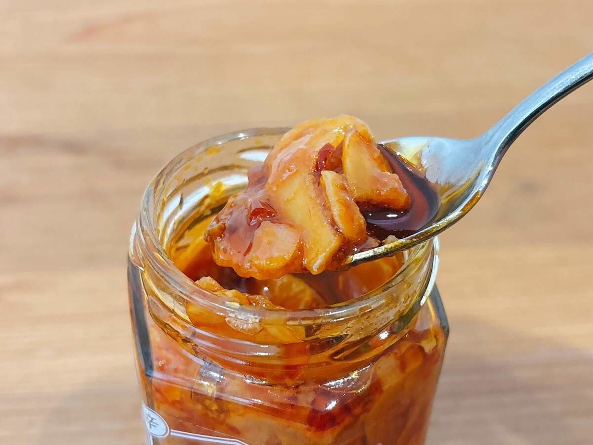 青いにんにく辣油に比べるとにんにくの香りは抑えめで、梅の風味の方がはっきりと感じられます。
