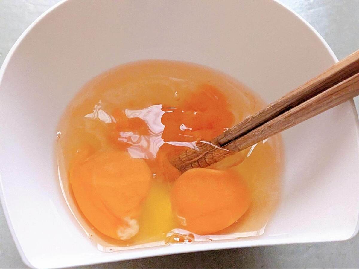 ボウルに卵3個を割り入れ、箸で10回程度混ぜましょう。