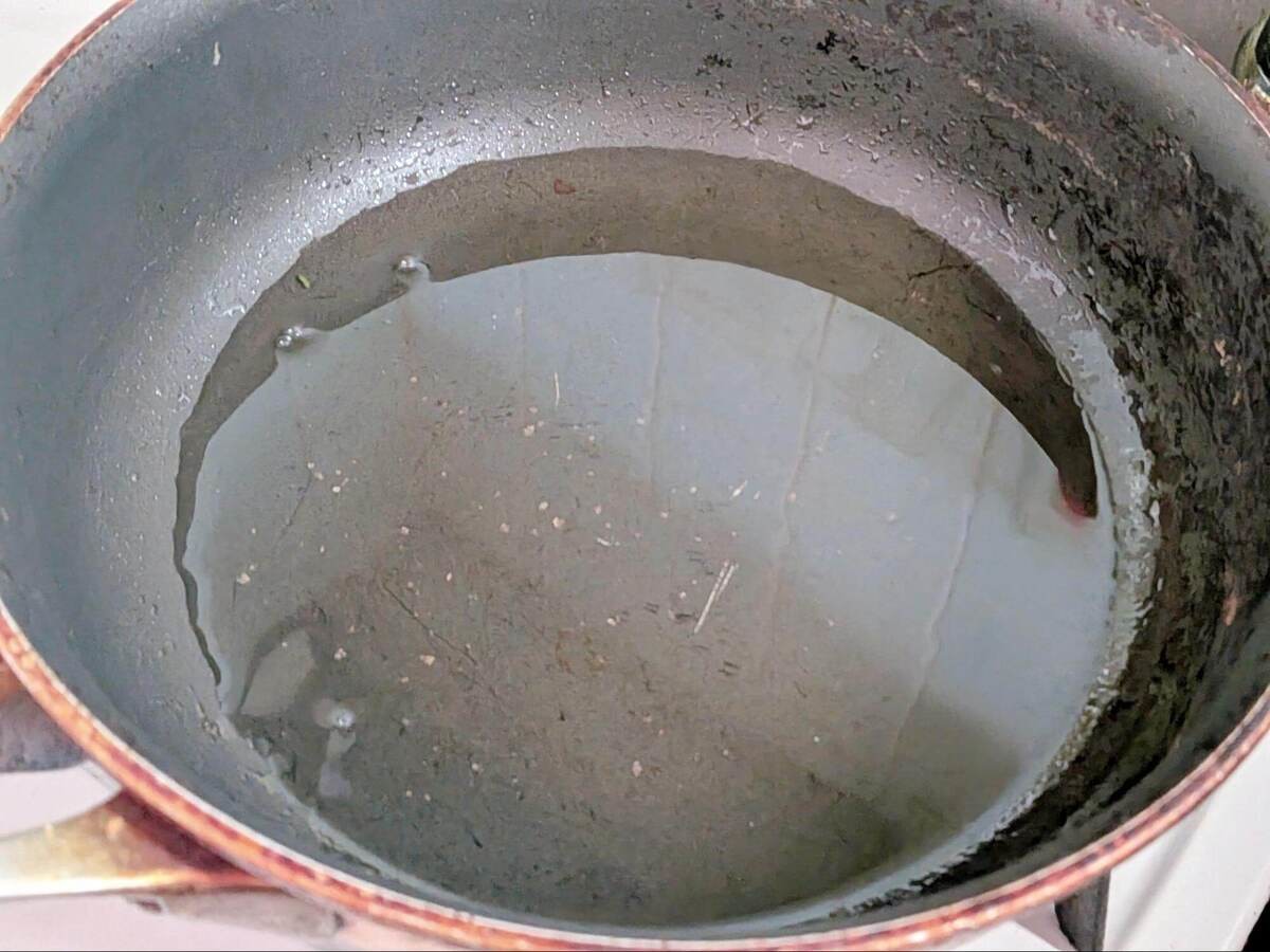 小さめのフライパンにたっぷりのサラダ油を熱し、鍋肌によくなじませたら、余分な油は別のボウルなどにあけましょう。