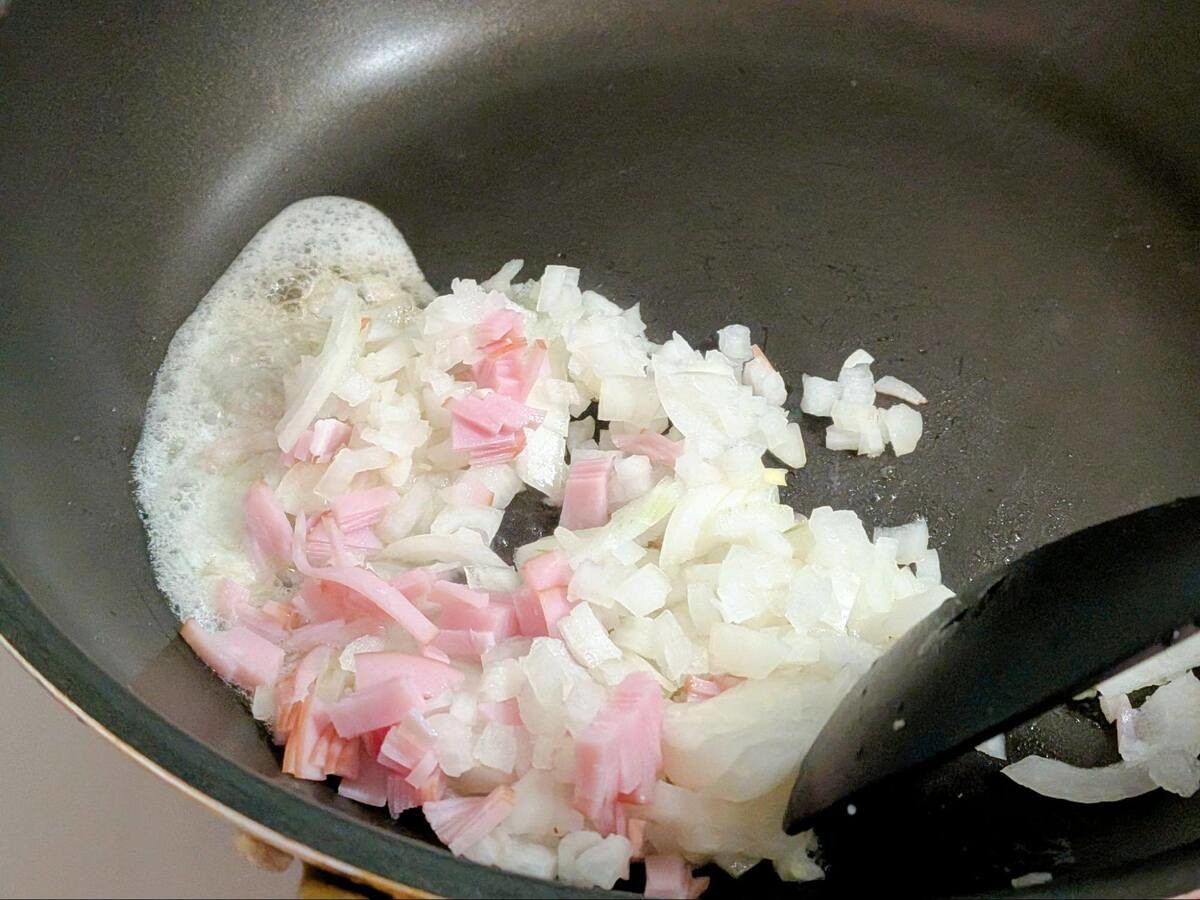 フライパンにバター(大さじ2)を熱し、中火で玉ねぎとハムを手早く炒めましょう。