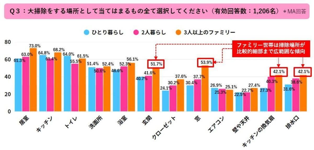 一方でファミリー世帯では、家族で分担できることもあってか、手間のかかる場所も積極的に掃除する傾向が見られました。