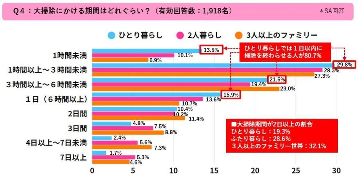掃除にかける時間にも差が。ひとり暮らしでは「1時間以上~3時間未満」がもっとも多く、1日以内で大掃除を終わらせる人が80.7%にも上りました。
