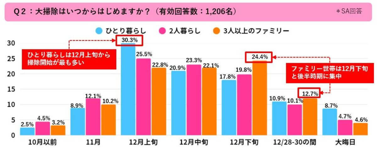 ファミリー世帯では年末に近づいてから一斉に取りかかる傾向が見られたのに対し、ひとり暮らしでは帰省や旅行など年末の予定を見越して、早めに動き始める人が多いようです。