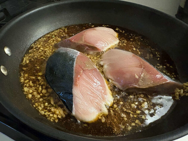 フライパンに、しょうゆ、酒、みりん、砂糖、①の生姜、ブリの切り身を入れてから中火にかけます。
