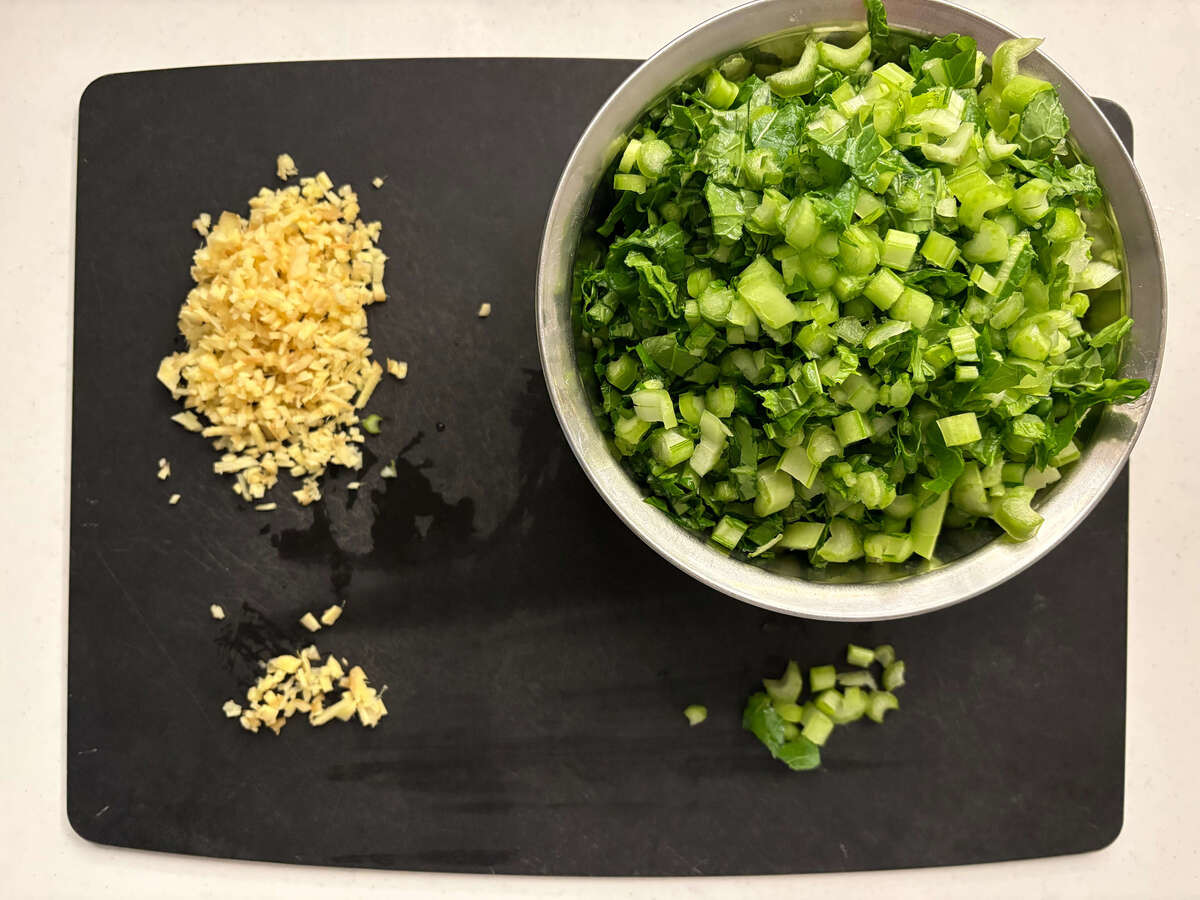 生姜とカブの葉をみじん切りにします。生姜は一度千切りにしてからみじん切りにすると切りやすいので、ぜひ試してみてください。