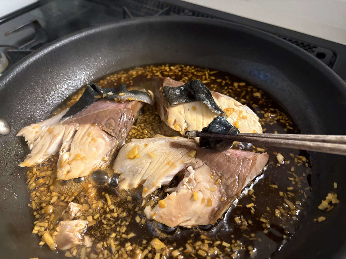 調味料がふつふつとしたら、しっかりとブリに火が通るように加熱をしていきます。ブリに火が通ると、ホロホロと簡単にほぐれますので焦らずにじっくりと時々返しながら様子をみてください。