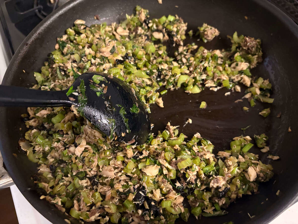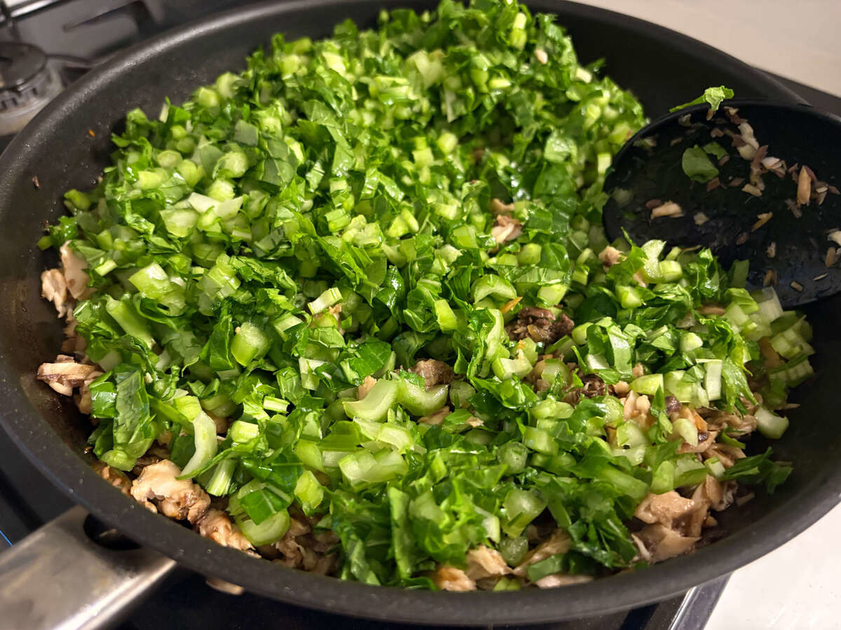②にカブの葉を加えて、しんなりとするまで炒めます。カブの葉がとても多いように感じて心配になるかもしれませんが、調味料やブリの脂を吸ってしんなりとして馴染んでいきます。