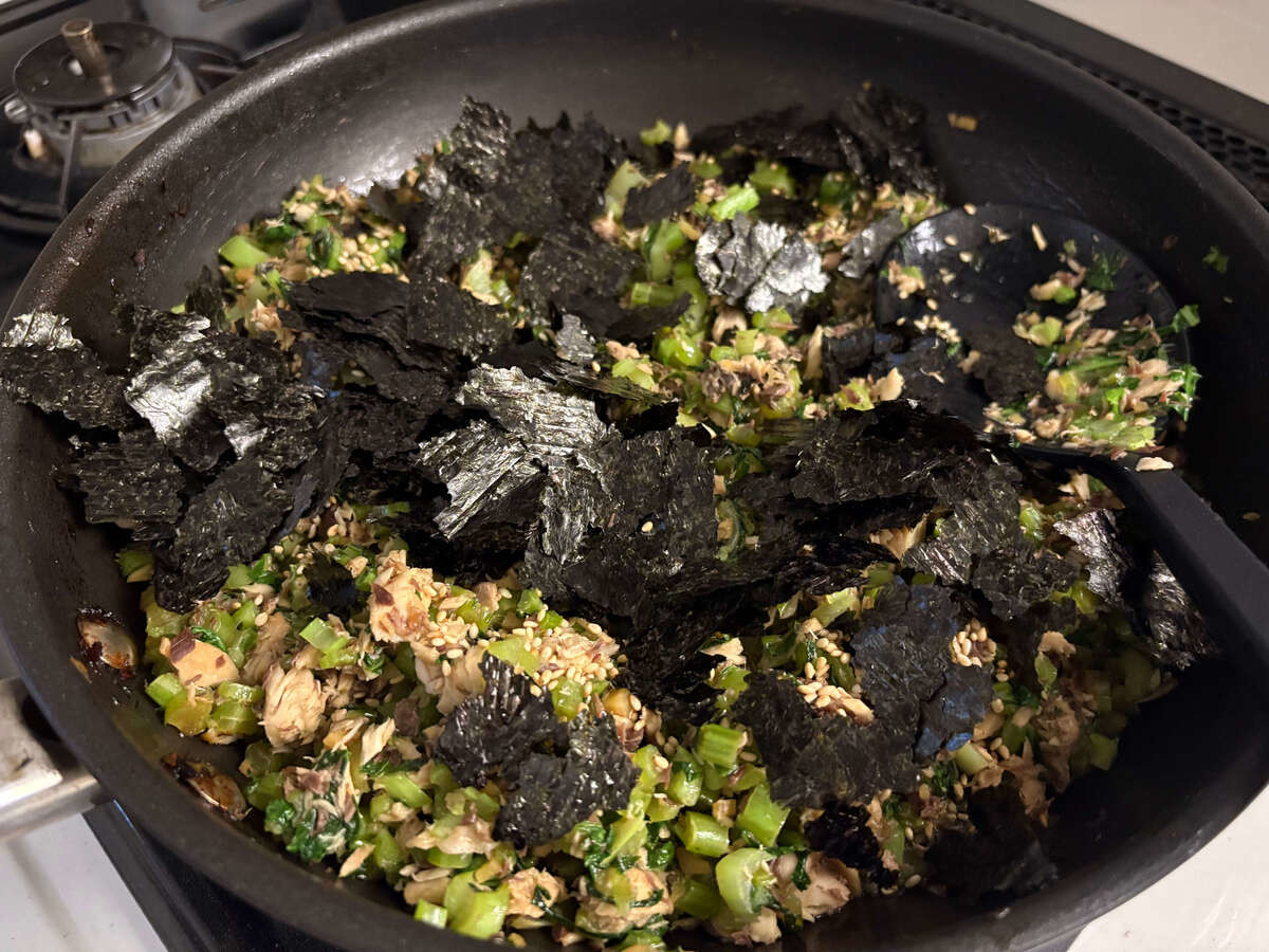 カブの葉がしんなりと馴染んだら火を止めて、ちぎった焼き海苔といりごまを加えてよく混ぜ合わせたら完成です。