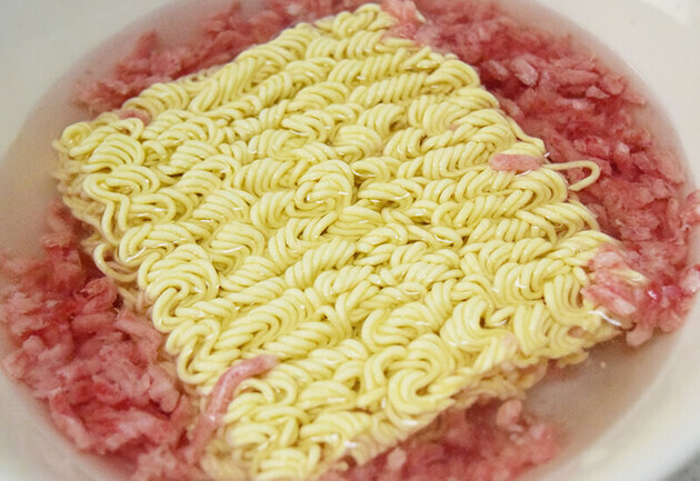 2. 麺の周りを囲むように豚ひき肉を入れ、ふんわりとラップをかけて電子レンジで加熱