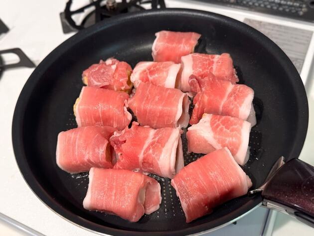 作り方②厚揚げに豚肉を巻きつけて、しっかり四面焼く