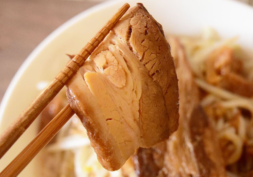 にんにく醤油ダレで味付けされた分厚いチャーシューは、とろけるようなやわらかさ。これは単品で購入して、自分好みのアレンジで楽しみたくなります。味も非常においしく、強くおすすめできる一品です。