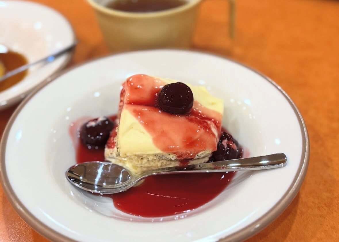 真っ白なティラミスに甘酸っぱいチェリーソースがかかっていて、大きめのチェリーもごろっと入っているので食べごたえがありますよ。