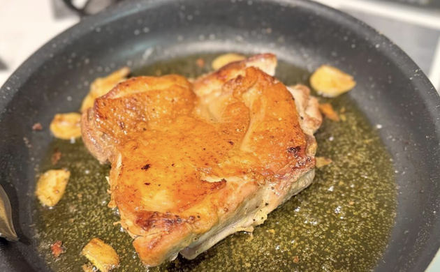 油をかけたところから、ほんのり肉の色がピンクになっていきました。少しずつ身側にも火が入っていくのが分かります。