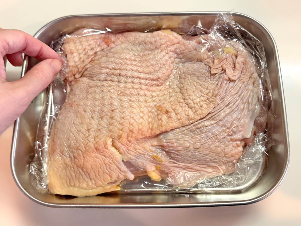写真では鶏肉の上からラップをかけているのですが、皮の上はなにもないのが正解です。