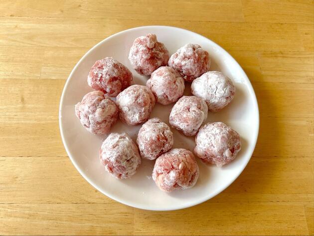 下味をつけたお肉を大きめのひと口大に丸めて、片栗粉を満遍なくまぶします。
