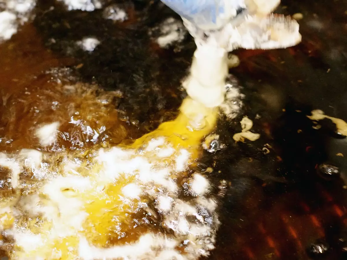 その後、冷めても衣サクサクで美味しく召し上がっていただけるように、角上魚類オリジナルで調合した天ぷら粉の衣をつけて、カラリと揚げていきます。