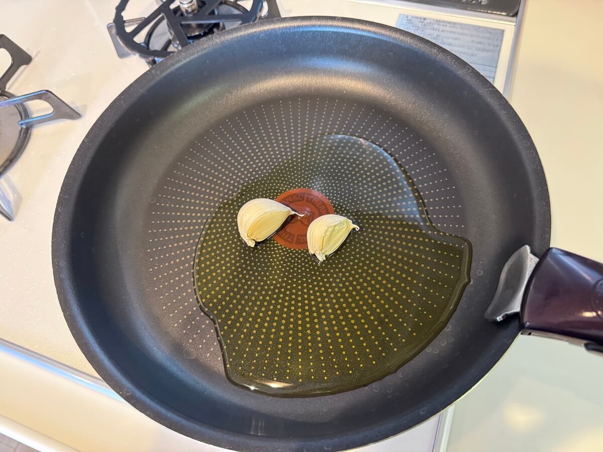 フライパンにオリーブオイルと皮付きのにんにくを入れ、弱火にかけましょう。
