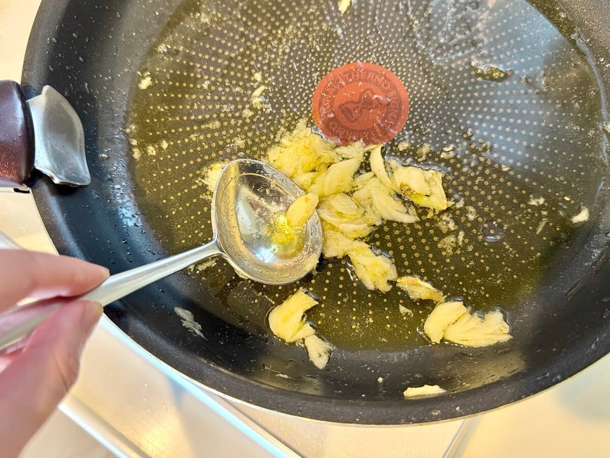 フライパンににんにくを戻し、スプーンなどで潰します。