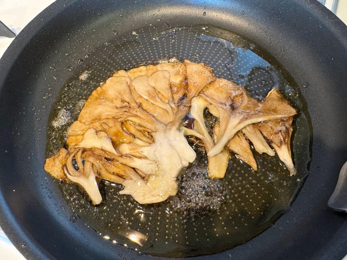 このあと重しをのせて焼くのですが、急に重しをのせると舞茸が割れてしまう恐れがあります。
