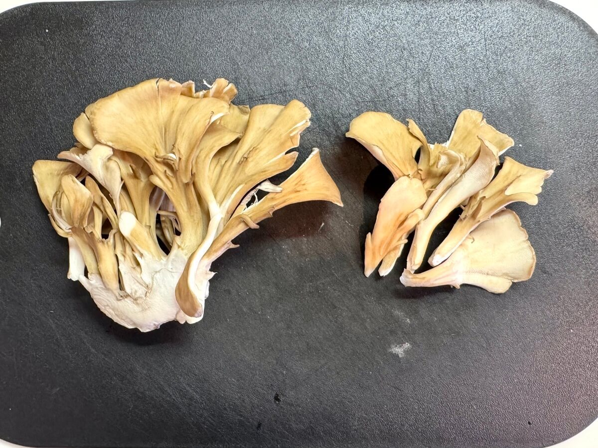 少し小ぶりな舞茸だったこともありますが、しっかりプレスしたことでこれほどかさが減るのですね。