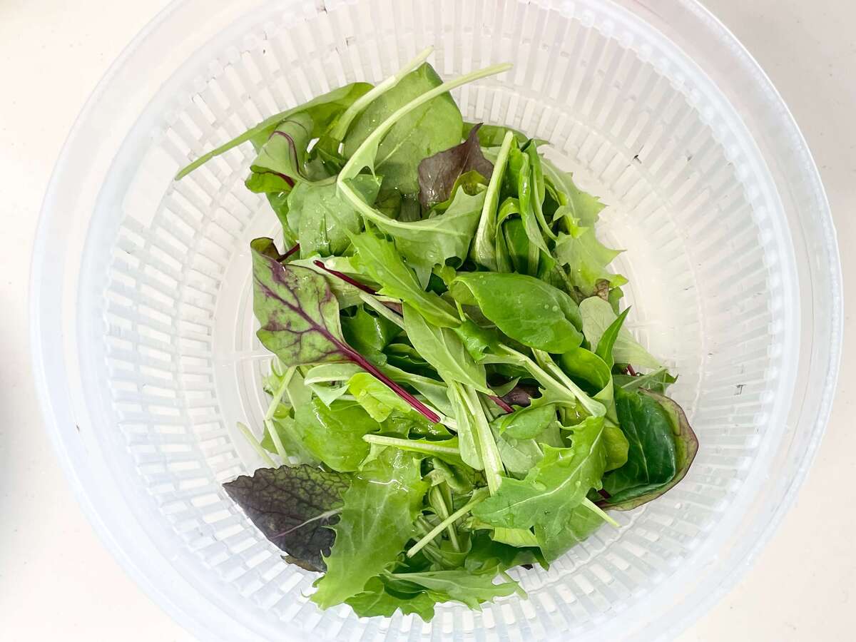 ベビーリーフは冷水にサッとさらしてからザルに上げ、 水気を切ります。