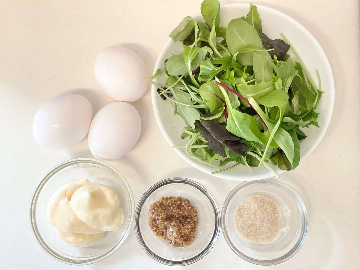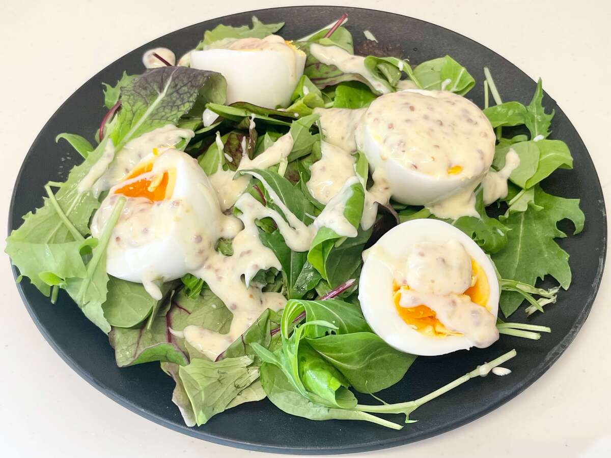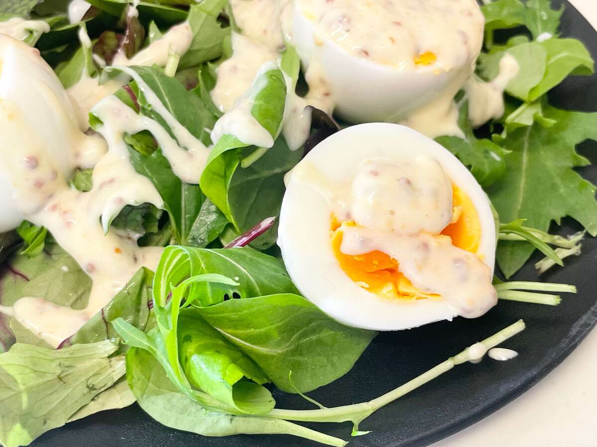 お皿にベビーリーフを盛ったら、ゆで卵をのせてマヨソースをかけます。