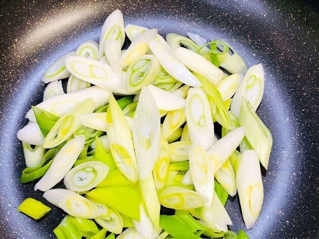 1.長ネギを斜め切りにしてフライパンに入れる。(青い部分も少し入れる)
