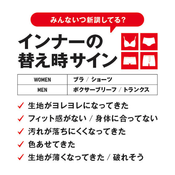 そこで、簡単に確認できる『インナー買い替えチェックリスト』をご用意しました。このリストを参考に、年末の整理や新年の準備に合わせて、インナーの状態を見直してみてください。