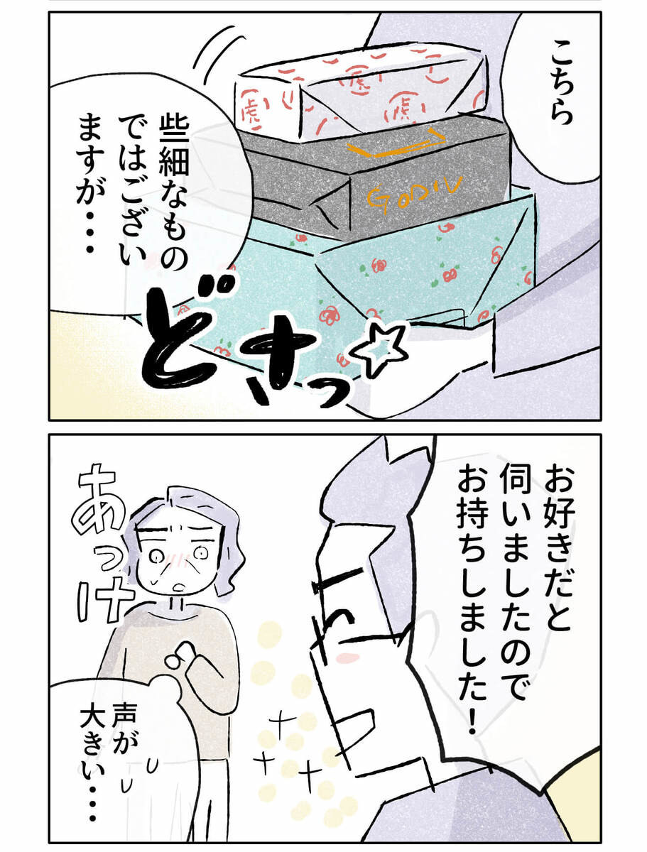 彼、悠馬さんはお母さんの大好物を山のように抱えて登場。それに対して、こんなものでは誤魔化されないわよと、ツンとするお母さん。いや〜〜〜難航しそうと思った途端、おおお、悠馬さんの深々としたお辞儀とお詫びで先攻攻撃をしかけました。