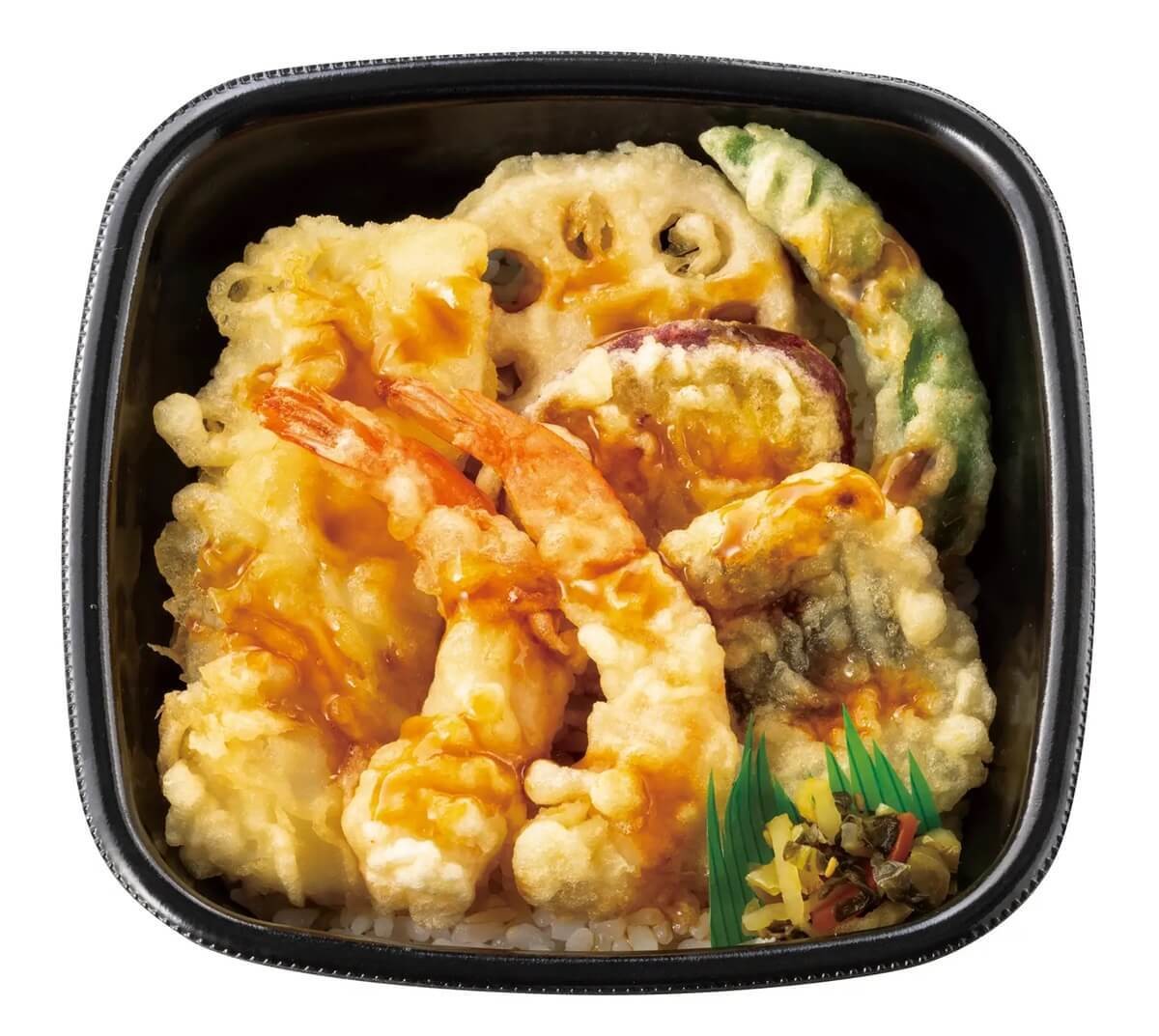 エビの天ぷら2尾、イカの天ぷらなどの海鮮天ぷらと、野菜3種の天ぷらを味わえる贅沢な天丼です。昨年に続き、期間限定弁当ランキング1位となりました。