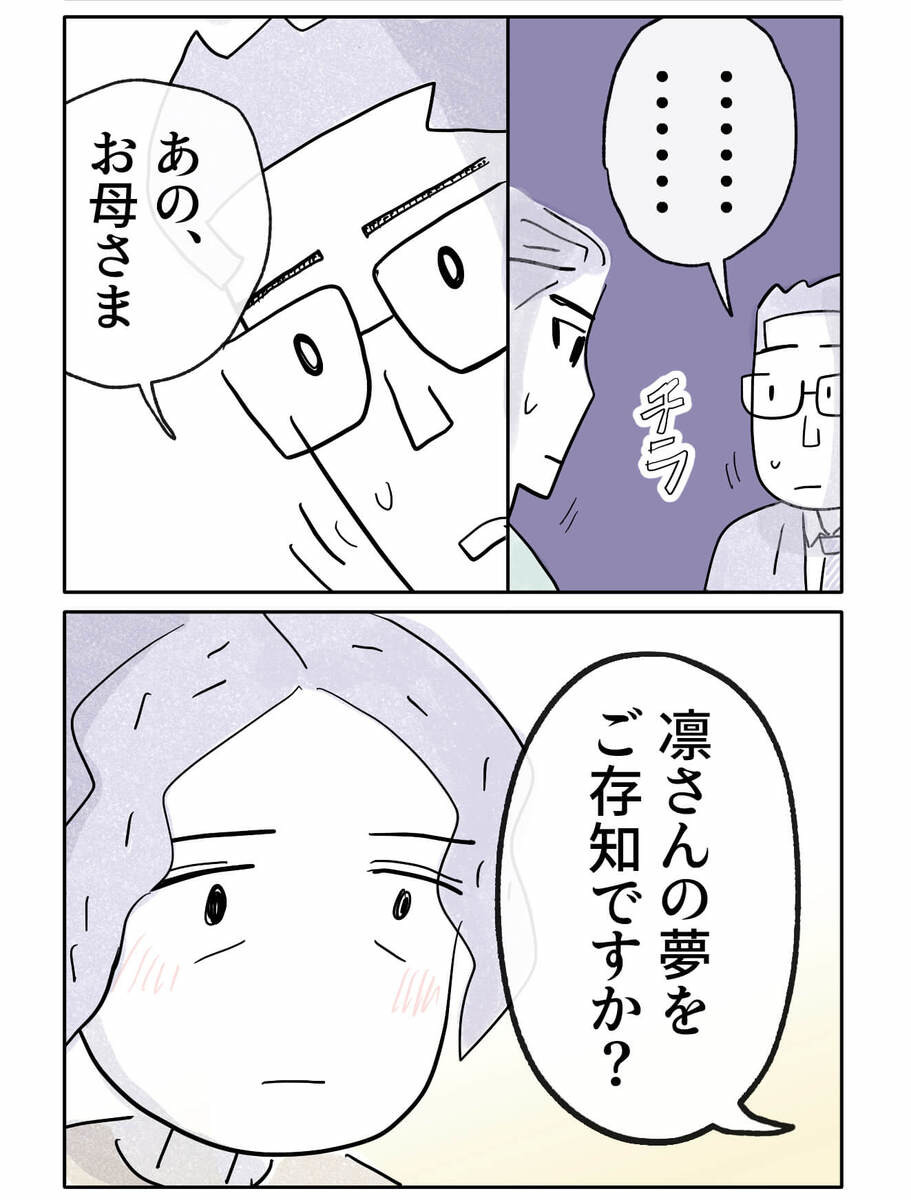 なのになのに、叔母ですら覚えていた凛さんの子どもの頃からの夢を、お母さん、まったく覚えてない(知らない?)のですね……。