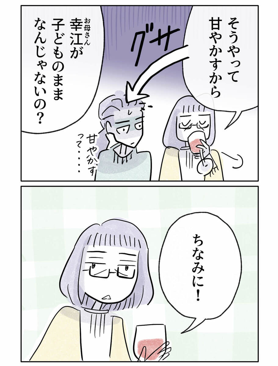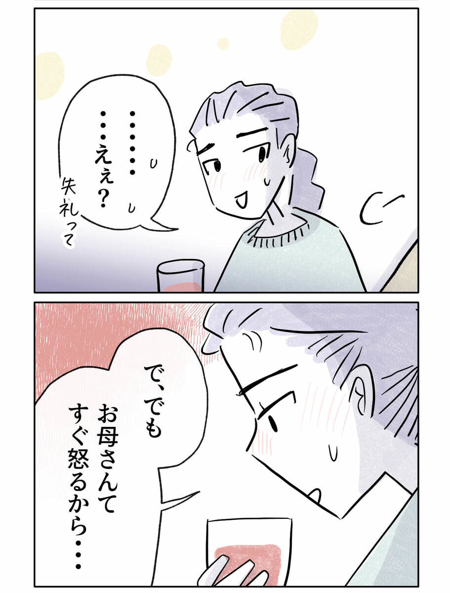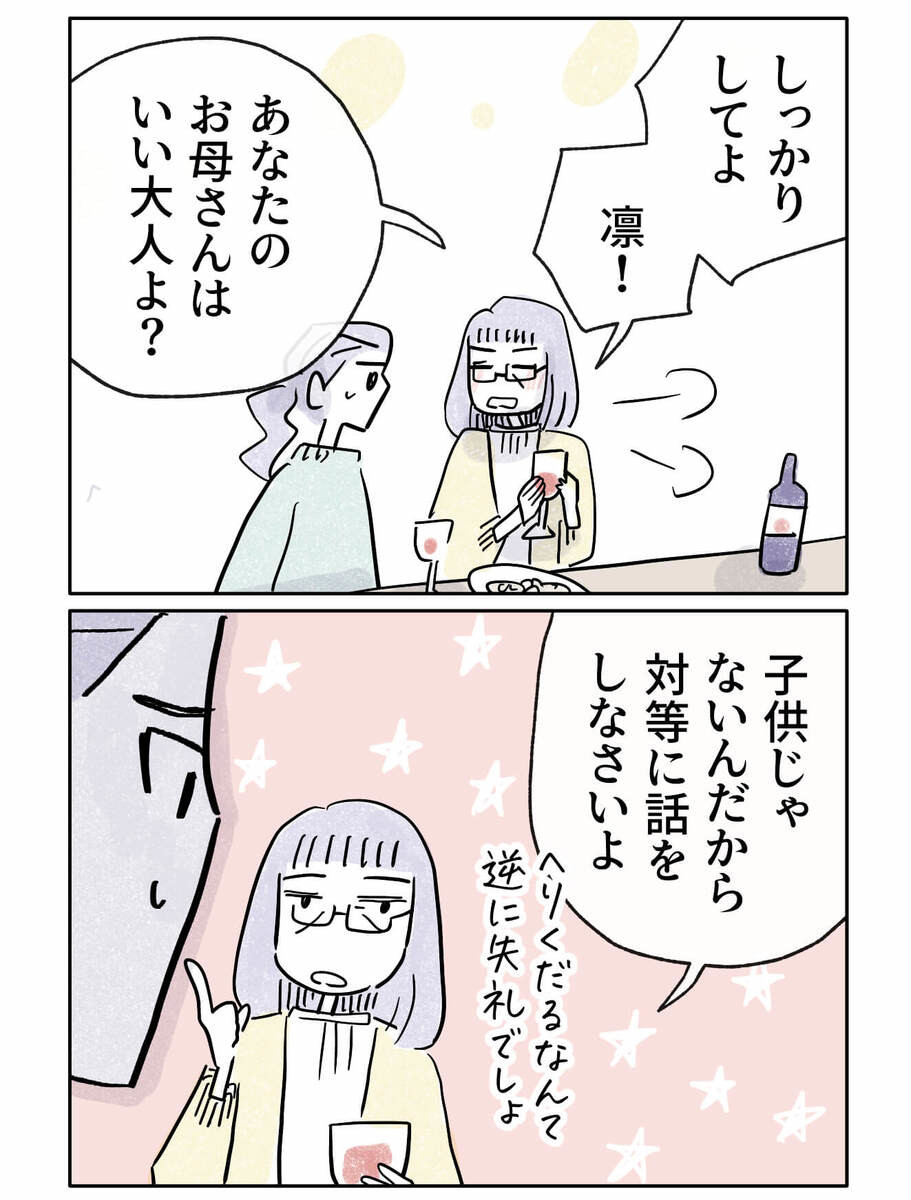 前回、りんさんがぽろりとこぼした“母の機嫌をどうやって取ろうか”といった発言に、叔母さんは思わずゾゾゾ!そりゃそうですよね、まともな大人の反応です。子どもが母親の機嫌を取らなきゃいけないなんて。しかもいい大人なのに。