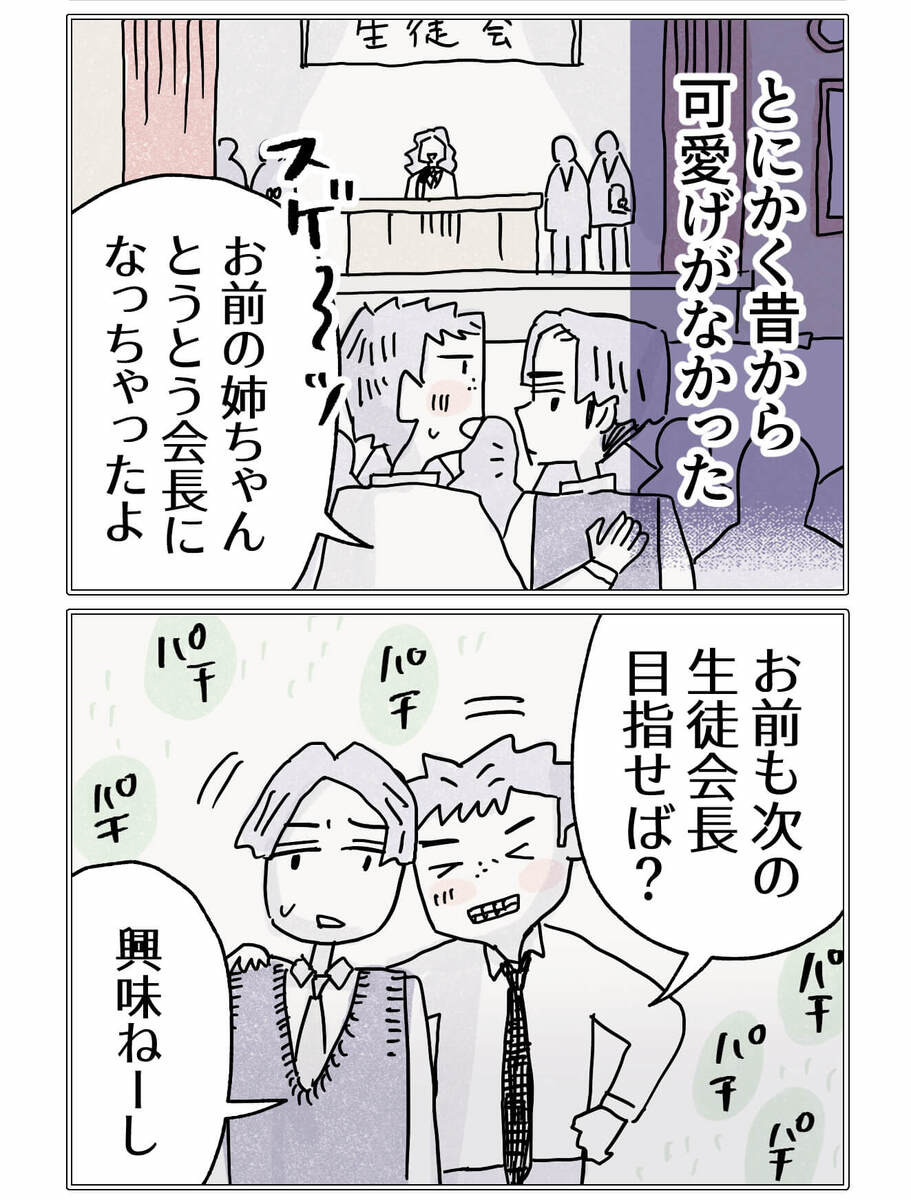 出来のいい姉を持って、しかも自分はあまり出来なくて、実はコンプレックスがあった様子。でも母親がもり立ててくれたから自信を失わずにすんだ、と。